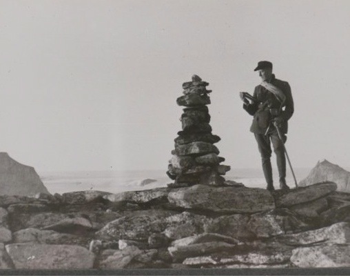 Reaching back and far away, today’s cairn comes from Greenland from an expedition in the summer of 1936. Hugo Pallin was a Swedish explorer on a mountaineering and research expedition to west Greenland. Here is a description of his trip, which comes from an album for sale on Ebay. “He proceeded from Copenhagen on the SS Hans Egede and went along the coast of Western Greenland, visiting Umanak (Uummannaq), Nugssuaq (Nuussuaq) Peninsula (Uummannaq district) and Pröven. After that he went up north on the coast schooner Sigrid to Upernavik Island, and extensively climbed it in the vicinity of its highest peak Sanderson’s Hope. Together with J. Bjarnow, the district medical officer in Upernavik town, Pallin proceeded up north on motorboat to Melville Bay, usually inaccessible in summer, as the main destination. There the party made several ascents of Devil’s Thumb, Cape Seddon, mountains of Holms Island, Nuussuaq Peninsula (Upernavik Archipelago) and a number of small islands.”