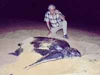 Pachu con un tinglar.Desde aquí arriba veo los manatís y las picúas y las aguavivas y todos los pececitos que nadan en nuestro mar. Y los tinglares que llegan de noche a poner sus huevos. En esa playa mi abuelo, Pachu, y mi mamá y muchos otros ambientalistas han protegido y ayudado a cientos de tinglaritos a que encuentren el mar sin percance.Esa es mi playa. La playa del Machuchal, mira que bella se ve desde esta altura al amanecer, mira aquel grupito haciendo yoga y aquella pareja jogeando y otros caminando por la orilla para empezar su día con un poco de sol y salitre. Después más tarde vendrán los corillos a jugar paletas o volibol o a tirarse en la arena a leer o hablar, y vendrán algunos vendedores ambulantes con sus refrescos y cervezas. Y míralos al atardecer, el sol poniéndose y los que quedan dándose un último chapuzón antes de irse a sus casas. Y entonces cae la noche...