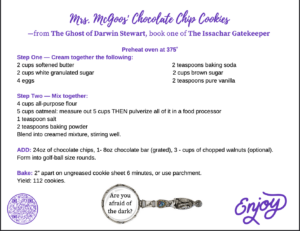 Our heroine, Lucy, has a wonderful neighbor, Mrs. McGoo, who always comes through to save the day with her delicious chocolate chip cookies. Lucy’s best friend, Schuyler Williams, says, “A really good chocolate chip cookie is nearly a spiritual experience, don’t you think?” So, we are sharing this recipe with you so you can sit, relax, and share some with a friend. Enjoy!