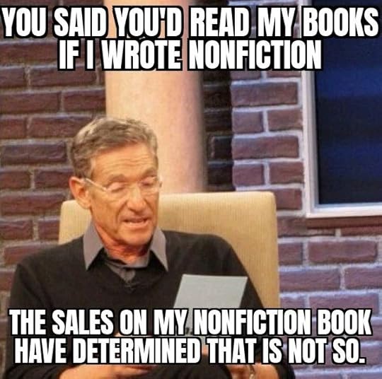 The funny thing is, when I started writing novels, I had quite a few people tell me that they didn’t read fiction, but if I ever wrote a nonfiction book, they’d read it. My sales, ratings, and reviews have not proven that to be the case.