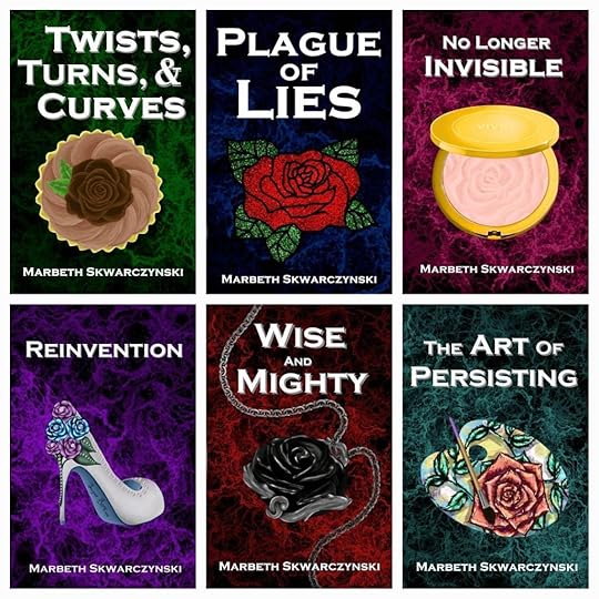 When we were discussing Plague of Lies, books featuring the backs of characters on covers were a new rage. I flirted with following the trend, but it just wasn’t me. After several discussions, however, Kay and I decided on a jewel-toned background with a single image to represent the overarching story. For Plague of Lies, the image was an embroidered rose patch. That patch was sewn on a mother’s hospital bag. Later, that bag, and its sparkly red rose, became the property of the daughter. The cover of Twists, Turns, and Curves features a chocolate cupcake decorated with a rose, a dessert created by the main character, after being forced to change careers. We were working on the third cover–a compact representing a character freed from an abusive situation where she was expected to fade into the background–when Kay mentioned that she’d saved the covers in a file titled, “The Rose Collection.” Her name for the series was perfect.