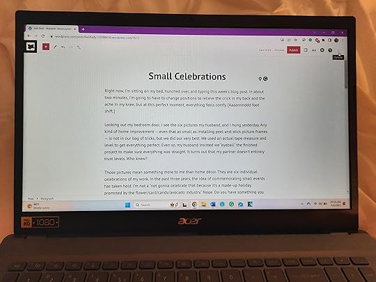But yesterday was THE DAY! We were about to hop on a video call with our out-of-state grands and remembered (again) that the blank wall behind us was supposed to be filled with my book covers. This time, I wrote it down so I wouldn’t forget (again): HANG UP BOOK COVERS. After our call was over, my husband and I began the process, and I’m overjoyed by the result.