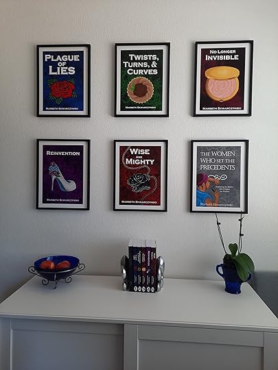 When we moved into a new apartment last summer (to be closer to our Nevada granddaughter), we had the opportunity to start fresh. There’s a writer that I follow whose publisher sends her a framed book cover for each of her mystery titles. I loved the idea, and since I am my own publisher, I decided that I would dedicate a wall of our new place to my contemporary novels.