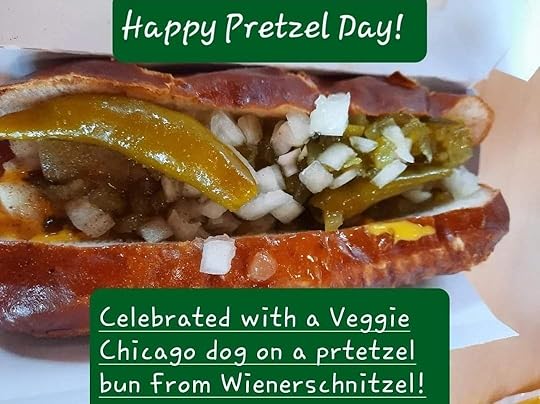 And while I’m writing this, I just have to say I’m a little annoyed at the Pretzel Day people this year. I missed it, which means I missed my opportunity to eat a vegan Chicago dog from Wienerschnitzel ON A PRETZEL BUN for this year’s celebration. I did later eat a vegetarian backyard dog on a pretzel bun (order mix-up and NOT on Pretzel Day), and it was good, but the Chicago dog is AH-MAZE-ZING, as you can see from last year’s picture.