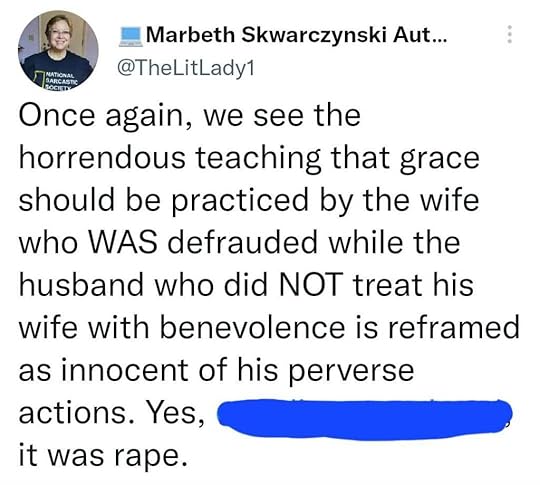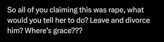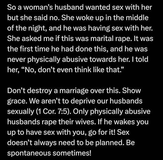 Then, on Twitter, the warriors locked arms against the heinous teaching that it is okay for a man to ignore his wife’s clear “no” and sexually assault her when she’s asleep. It is shocking that we have to verbalize that this man’s action is terrible. Or that a woman, who claims to be an “older woman teaching the younger,” would tell the victim that she should never have said no in the first place because it “defrauded” him, according to the Bible. The victim was told that her reaction to the rape should be to show “grace” to her rapist (after all, he only did it that one time — so far).