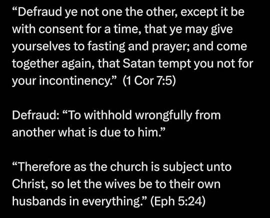 The OP claims that she’s following the Bible’s clear-cut instructions, but in reality, she carefully chooses verses that back up her already set-in-stone-beliefs. She loves to refer to I Corinthians in her arguments, but not ALL of I Corinthians. For instance, she tends to overlook the MUTUAL nature of a marriage. It turns out that BENEVOLENCE goes both ways.