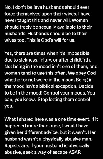 She didn’t say that the man who was told “no” to have grace for his wife who didn’t feel up to a sexual encounter. She then claims that she’s never taught that men should force themselves on their wives, but in her original post, she did exactly that. She then claims that the woman’s husband was NOT physically violent.