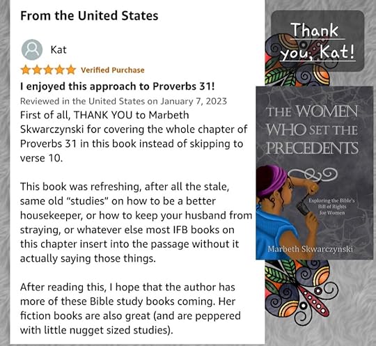 When I became aware of those issues, I was ready to knock the dust off my shoes and never look back. But I stayed. I talked. I gave others information about where they could research. I published another book — this time a non-fiction book — about women in the Bible. I used the prophecy of Bathsheba in Proverbs 31 as my template and explored the lives of biblical women exhibiting the rights outlined in that passage. My very first chapter was about Bathsheba — her whole story. She is so much more than a blameless victim of rape. She became a leader in her own right. She gave advice to kings.