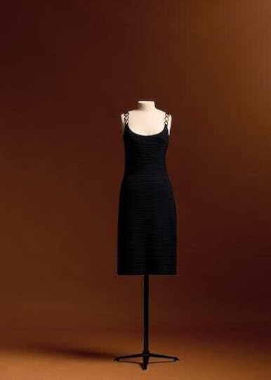 This iconic LBD is pure 90s minimalism and boasts a body-hugging fit with straps made of tortoise shell-like linked chains, showcasing the signature St. John hardware details.