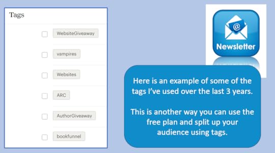 I already touched on how to use Tags to segment off your one audience list. Above I have a snapshot from the video and it shows an example of some of the tags I have used with my giveaways both at Bookfunnel, SiteOrigin and my website at readfirstchapter.com.