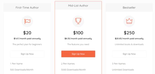 The first package called First-Time Author costs $2o per year. This is good enough for a new author or anyone else operating on a shoe string. With the $20 package, you are entitled to one pen name, and up to 500 downloads per month.