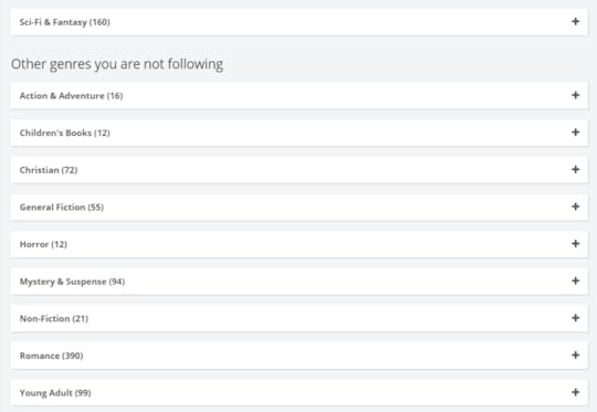Above is a screen shot of the promotion genres that are at Bookfunnel every month. These are numerous promotions in each of these categories. When you click on the plus-signs, a longer list of promotions opens up in each of these categories. As you can see, just about every genre of fiction and non-fiction is covered.