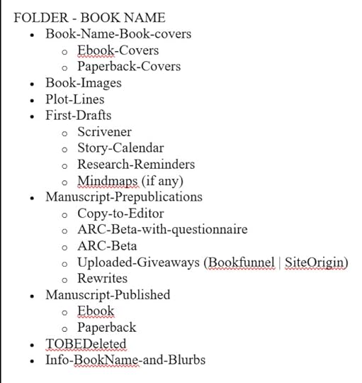 The other file that may need some explanation is “TOBEDeleted”. I am paranoid about deleting anything before publication. So the old final manuscripts or anything else that I know I don’t want or need, I put into the TOBEDeleted file. Once my book is safely published, I then delete everything at that time.