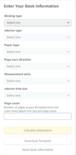 Once you click through to the paperback template calculator shown to the left, fill in the following information based upon your own choices. Once you put in your particular page count, click on Calculate Dimensions.