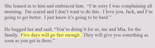 As an author, I will often tweak the script, especially as I’m writing. It’s too easy to forget this early reference to five days. By highlighting it, it’s a reminder that this timing needs to line up with something later on in the story. I find this highlighter a great author tool.