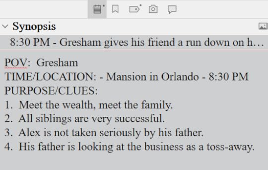 EIGHT: USE SCRIVENER SYNOPSIS SECTION TO KEEP TRACK OF CLUES DROPPED:When writing the first draft, I use the Scrivener Synopsis section in the Inspector Pane to list the clues I have dropped in that scene. Once I’ve finished the first draft, I can open the project in Outline View and this will give me a bird’s eye view and chronology of the clues that have been dropped.