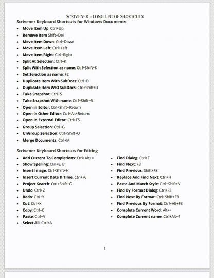 Scrivener Tip – Long and Short Lists of Keyboard Shortcuts