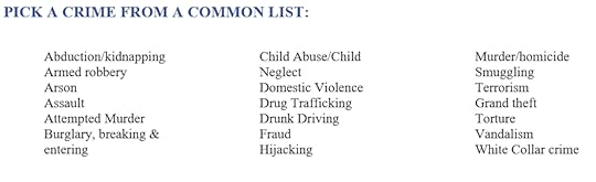 START BY PICKING A PROTAGONIST OR A CRIME:I start by picking a crime. My inspiration can be from a novel I’m reading, or a news article, an episode of Forensic Files, or sometimes they can be a combination of all of these. I am beginning to think more like an author and am starting to envision crimes happening in strange places or interesting environments.