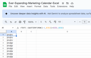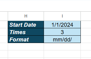 I hired an excel coder to create an excel calendar with the coding inside of it that can be created with the click of a button. To the right you can see three boxes. The first one is the start date. You will change to 01/01/2025 or whatever year it is.