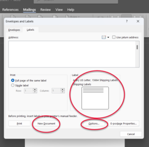 3. Now my system defaults to a return address and your Word may default to something else, but we need to choose a setting to print the 6 postage labels. So first choose the Options button, which is at the bottom on the right hand side. The big red circle shows the small label that my system defaults to and I'm just pointing out the "New document" button for later.