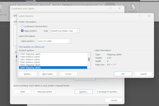 Then you will find another drop-down list of at least a hundred labels to choose from. Labels 15664 will give you the 6 labels per page. But if your system doesn't have this number, look for one that has the same measurements as are posted on the right hand side: 3.33" x 4". That will give you the 6 postage labels per page.