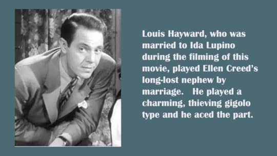 The movie also starred Louis Hayward, who was married to Ida Lupino during the filming of this movie. He played Ellen Creed's long lost nephew by marriage. He played a charming, thieving, gigaglo type and he aced the part.