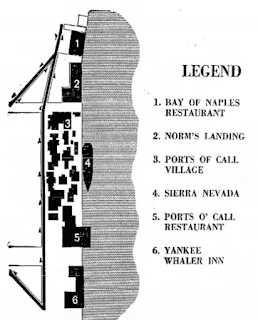 I've already indicated that Tallichet built the Yankee Whaler just south of the Ports O' Call Restaurant. The Ports O' Call Shopping Village opened just north of the Ports O' Call Restaurant. Immediately north of that was Norm's Sportfishing Pier. Demonstrating that Tallichet and Hagen had every intention, as of 1963, of working together to knit all of these businesses together into one huge shopping and recreation center, Tallichet built a third restaurant - Bay of Naples - just north of Norm's Pier.