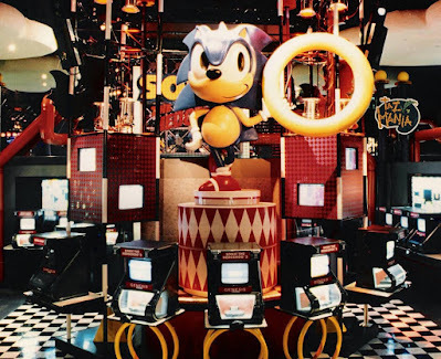 Upon entering, guests were greeted by an enormous Sonic the Hedgehog statue holding a golden ring. At the base of the statue, potential customers could sit and play Sonic 3 on Genesis with a 5 minute time limit. This was the "Future" area. One wall in the "Arcade" area featured a huge setup of Virtual Formula arcade cabinets, a simultaneous multi-player racing game in scaled-down F1 cars. Other areas included "Action Adventure" and "Kids", which featured tiny game stations appropriate for the 5-7 set. Nearly every foot of the space was crammed full of Sega games and sparkling with lighting effects, and it was entirely possible to lose an hour or two just in that one area; most of us kids who saw it in person did just that.
