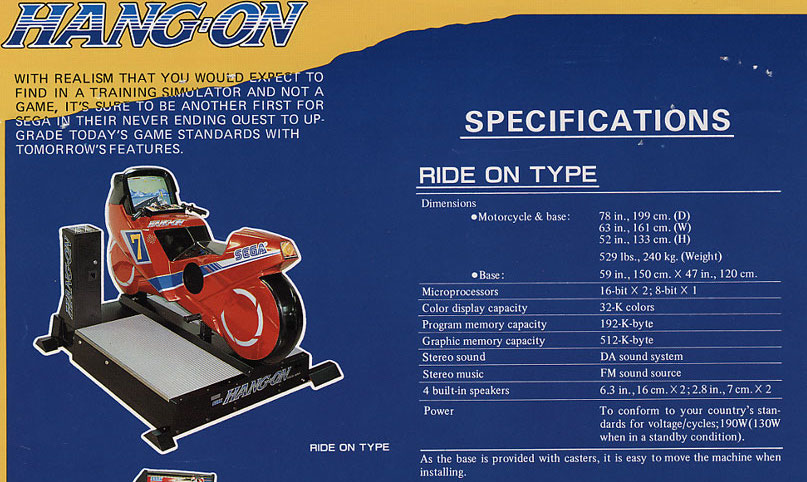 As an arcade developer of the era, Sega was respectable but second tier. They produced their own weird knockoffs of Space Invaders and Pac-Man, just like the rest of the video game industry. Even their Japanese home console, the SG-1000, was a distant second to Nintendo’s Famicom. But all of that changed in 1985 with the introduction of Yu Suzuki's Hang-On. Hang-On wasn't too different from other race games of its era, but what made the difference was the arcade cabinet - a scaled down motorcycle that players steered by shifting their weight. The game was a smash hit everywhere, and Sega had discovered their metier.