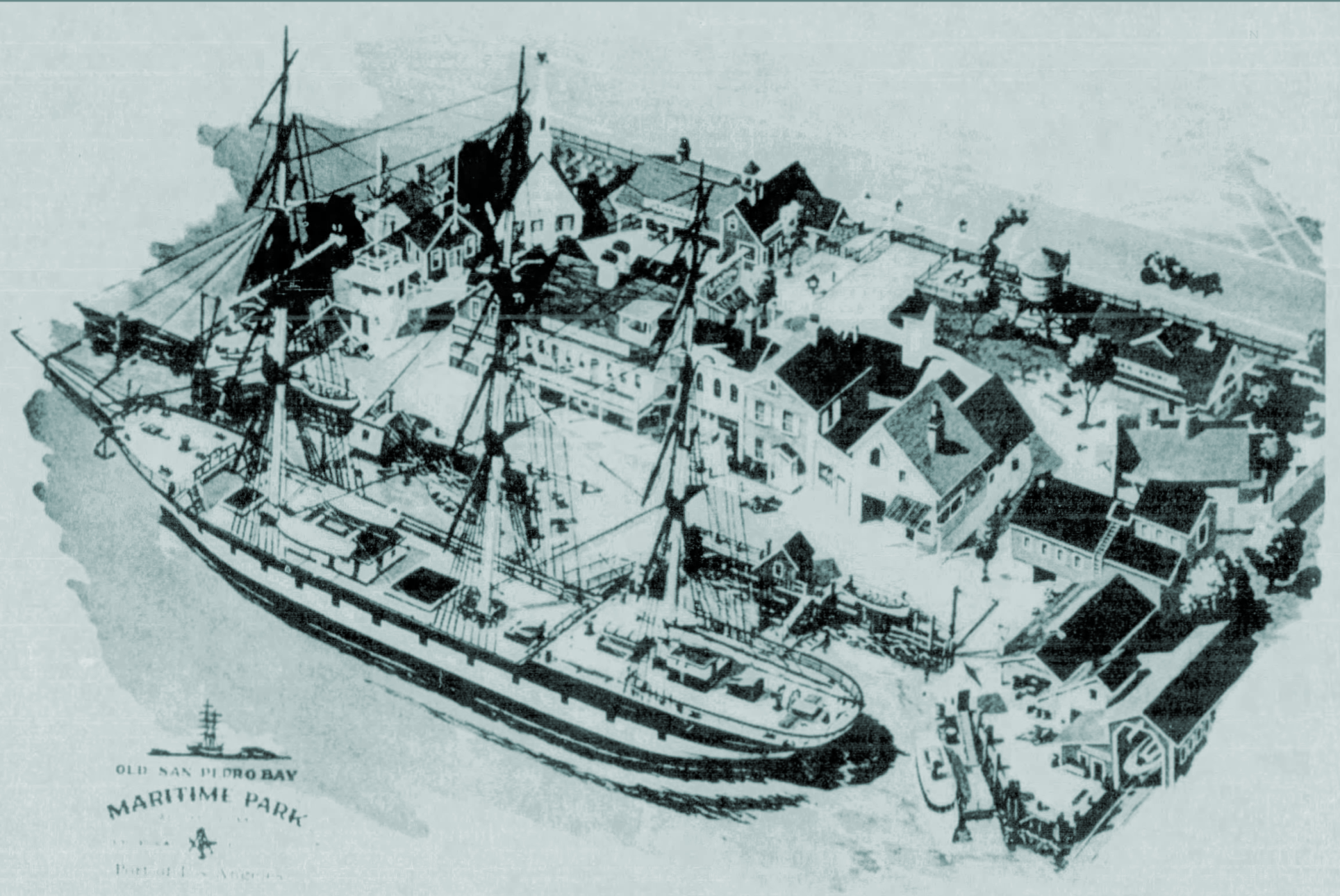"His plans included replicas of an old San Pedro church, the Exchange Hotel, a railroad museum, and the port's first pilot and marine exchange station. He says the village area would have included some retail shops, but the [historic] sailing ship would have been the main attraction."