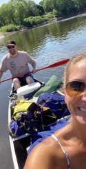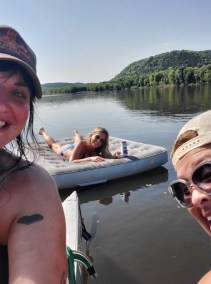 After about two hours of paddling, we found a canoe downriver stuck on a log on a sandbar — ours! My shoes and hoodie were still inside, as well as both paddles. It was a Christmas (in August!) miracle! Our tribe gathered around the runaway canoe, we got ourselves sorted and prepared to paddle. My canoe buddy offered to pull me on my air mattress if I’d prefer, and I probably should have taken him up on that, but instead we deflated the air mattress and paddled together.