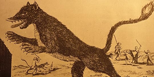 Okay, so what did La Bête du Gévaudan look like? Sort of a big cat about the size of a cow, if the illustrations can be believed. The Beast sported tawny/russet color fur with dark stripes, including one that ran down the length of its back and led to a very long tail. Big claws, big teeth. Oh, and did I mention that some reports say it could fly? I mean, no wings—but flying in that “can leap tall buildings in a single bound” kind of a way. It could also repel bullets and rise from the dead.