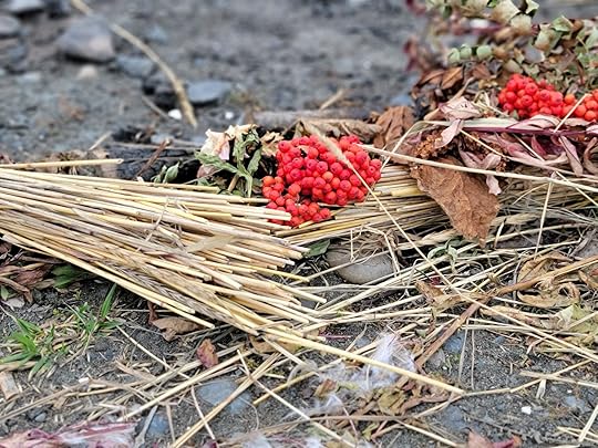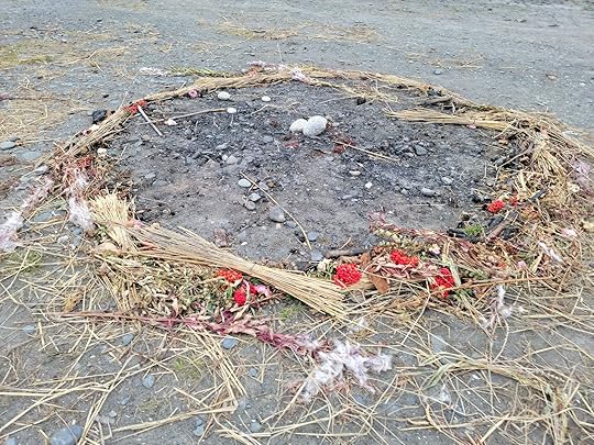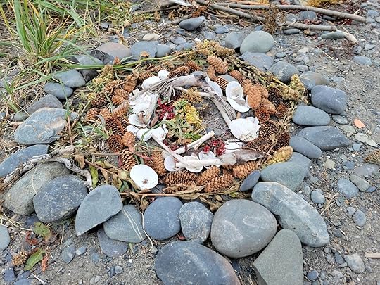 A few years ago my husband and I visited Alaska in the fall—and spent a few days in Homer. If you’re not familiar with it, it’s a small city along the southern coast, on the Kenai Peninsula. We stayed in a condo at the end of Homer Spit. All the tourist places that line the spit were closing up shop for the season, and everyone just had this strange air of longing (but also relief that the bulk of the tourists would be gone until the next summer). One day we made a pit stop at one of the beaches along the spit during bore tide and found a bunch of… well, they looked like fire rings but super fancy ones ringed in feathers, rocks, driftwood, berries, straw, etc. A short story immediately started forming in my head.
