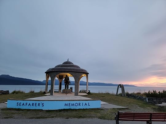 The only thing else I can tell you about the story is that in addition to the strange rings we saw on the beach that day (and the bore tide itself), another Homer Spit sight that makes an appearance in the story is the Seafarer’s Memorial toward the end of the spit, which is in itself really creepy. There’s a life-sized bronze seafarer statue in the middle of a dimly lit memorial, so if you drive past fairly quickly it looks like a random guy standing there, staring…not to mention that there are all these plaques along the inside of the memorial that list the names of the lost, their ships, and the date on which they died—and one of the plaques has been visibly wrenched off the wall with a great deal of force. That particular thing did NOT make it into the story, but in my head it’s all related.