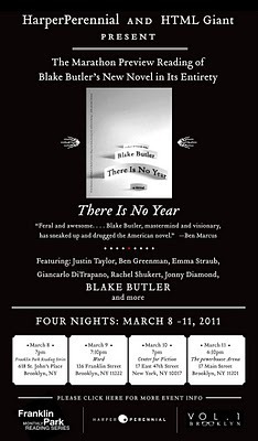 Interview at Bomb re: 4-night marathon reading of There is No Year in NYC, the internet as place, metaphor as fartcity, etc.