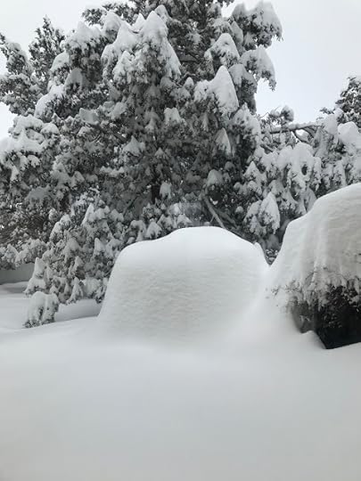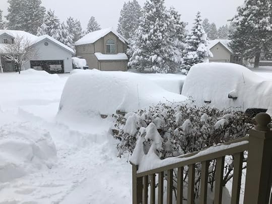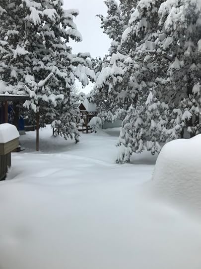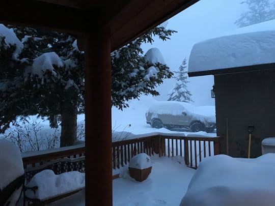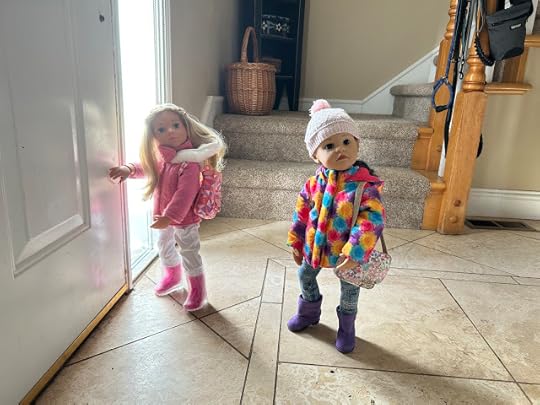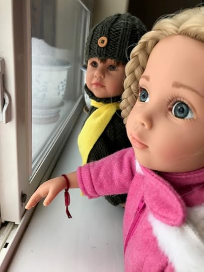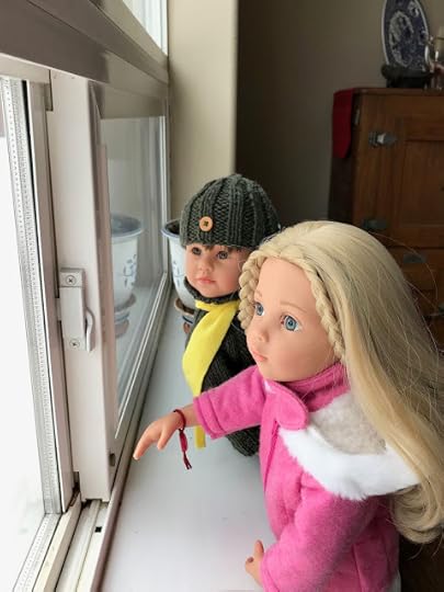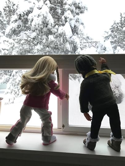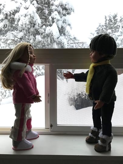 The two dolls went out through the dog door to the back deck. Billy set up his tripod close to the house, where the roof protected him, so his phone camera wouldn't get wet from all the snow coming down.
