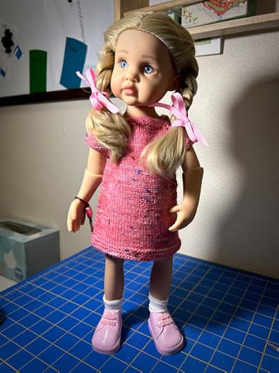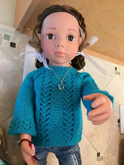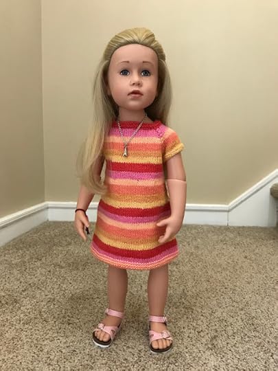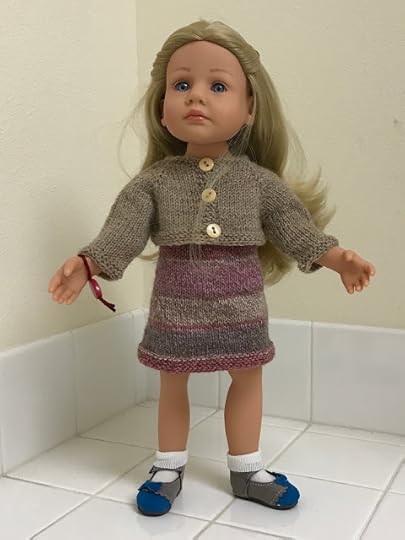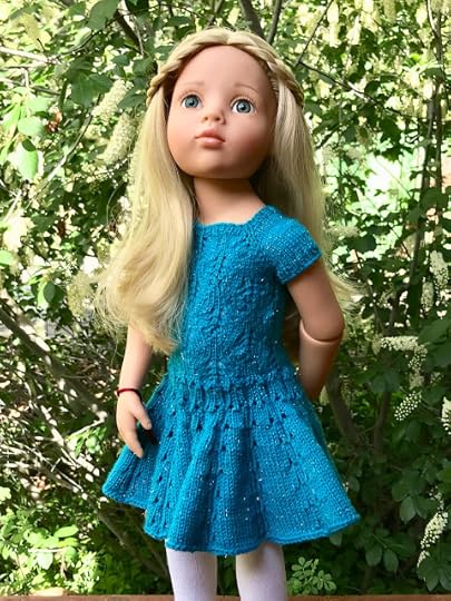 If you're looking for something fancier, there's the Viipuri Dress. You say it like VEE-poor-ee, which is the Finnish name for a city in Russia that used to belong to Finland. It only comes in the size for the larger dolls, like us, but a clever knitter might be able to figure out how to make it smaller using lace weight yarn and smaller needles. Thank you, Jolena!