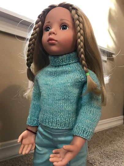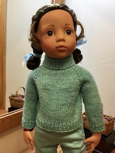 Sweaters or jumpers are very useful. This is our Wonderland Turtle turtleneck pullover, modeled by Veronika. This design is called a pullover because it looks like the kind of thing a human person can just pull on over their head, but dolls don't like to have things pulled over our heads. That's why all of our pullovers button down the back. So they're really pullovers in our imagination, then.