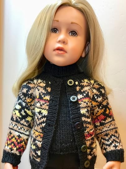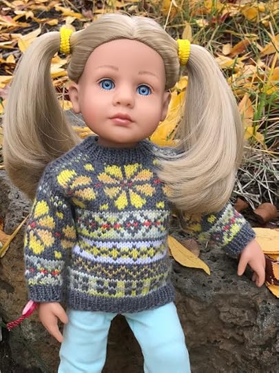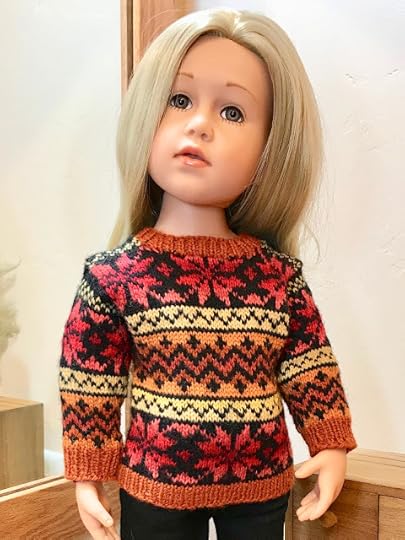Another pullover for knitters who have been knitting longer is this one, Lotte's Lotta Colors, worn by Charlotte. You have to know how to knit with two colors at a time to make this one. This kind of knitting is called stranded colorwork.
