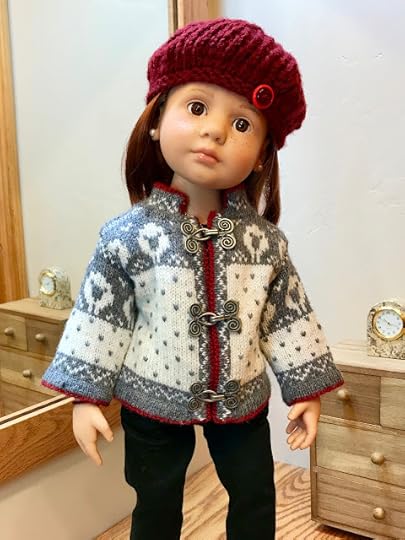 Some sweaters are just made to open in the front, like this jacket of mine. It's called the Stavanger Cardigan. Instead of buttons, it has something called clasps to keep it closed. Jolena has one with kittens and fish on it and green trim instead of this cranberry color.