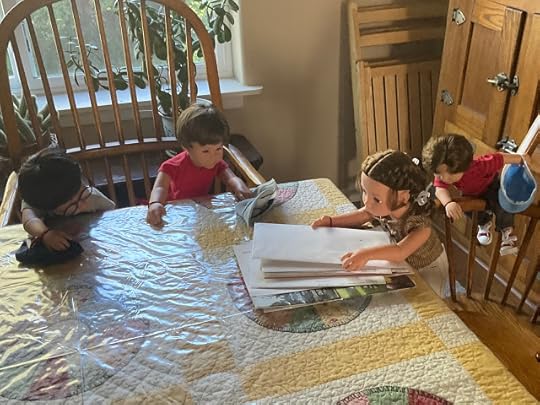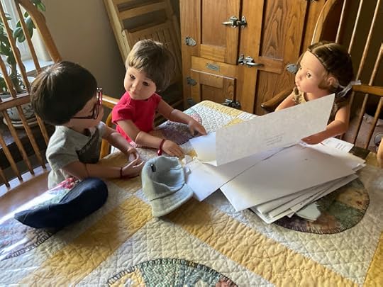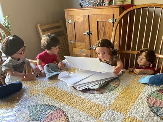 Veronika got up and went to the table, where there was a little pile of letters and catalogs. The boys reluctantly left the cookies and followed her. The dolls climbed up into the chairs at the table.