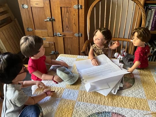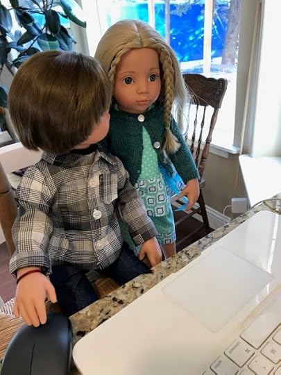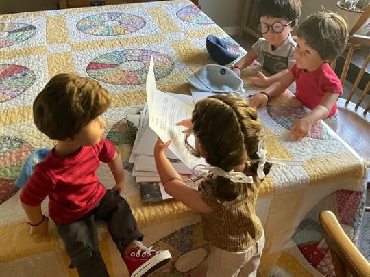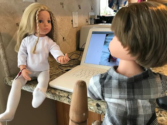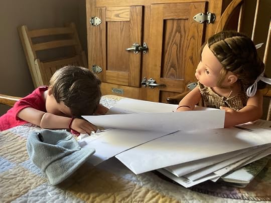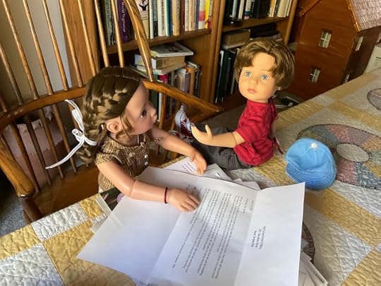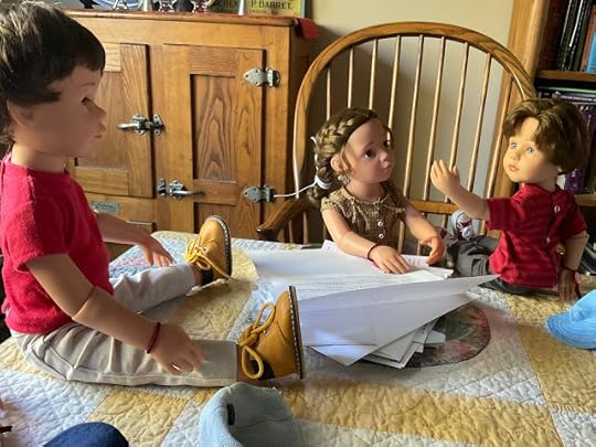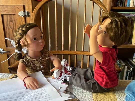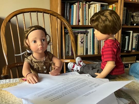 "Dolls without knee joints," Billy pointed out when he saw that Veronika expected him to explain, "will have to sit with their legs sticking out from under the desk. We will have to watch where we step when we walk by." He climbed up on the table, so he could demonstrate how these dolls had to sit.