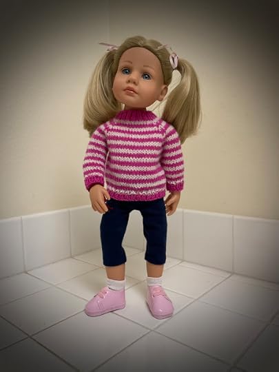 Another "pullover" is Pauly's Stripy Pullover, modeled by Pippa. It's suitable for both boys and girls, too. It uses two different colors of yarn, but you're only knitting with one at a time.