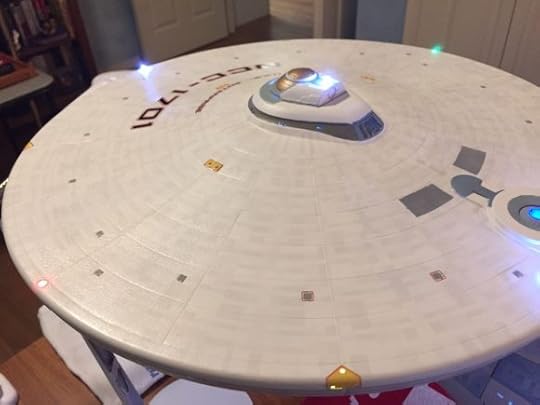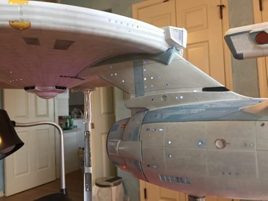 My completed 1:350 model of the starship Enterprise. (Photo: C. Jansmann)If you’ve read my bio in the back of each book, you might recall there is a line in there that one of the driving factors in diving into being an author was to find a way to unwind from the pressures of my day job. As fulfilling as my IT gig can be, there is no way to truly explain the stresses involved in trying to keep up with the constant changes in the field, nor the challenges of accommodating ever-shifting needs of our clients. To be fair, it’s meant I’ve enjoyed nearly thirty years of fascinating experiences that continue to keep me fresh and engaged, but it also underscores how important it is to find a way to unwind.