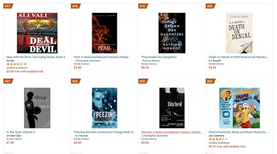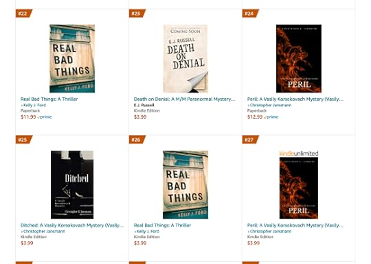 Hang on, are those my books…?Not one but two of my books — Peril and its successor, Ditched, were on the Bestselling New Releases list for my genre. It was a welcome surprise gift that continues to give, for as I write this, the Kindle edition of Peril has moved up to #18…