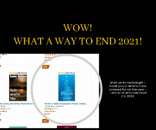 Vasily Korsokovach wound up being the lead in three of the four books I wrote in 2021. He is such an intriguing character for me — and so different from Sean — that it’s hard for me to put him aside. His first book, Pariah, has been a slow burner, taking a bit longer than I expected to catch on with readers — though there were a few shocking points on the calendar when Pariah broke the top 100 books on Amazon, the most recent being early December: