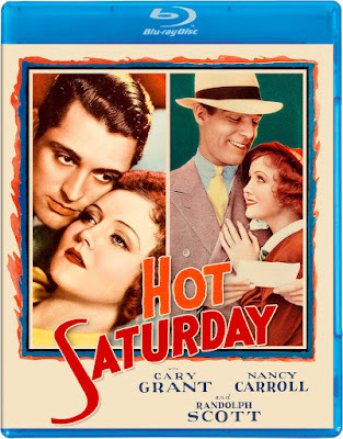 Hot Saturday (1932) is available on Blu-ray from Kino Lorber. It includes subtitles in English, a reversible cover (see both sides below) and commentary from film historian Lee Gambin. The commentary was really fascinating. There is a lot of cultural context given and some really interesting insights into how the film portrays the societal mores and gender politics of the time. There were times I didn't agree with Gambin's perspective. He notes that Edward Woods comes off as a good guy in the role of Connie and then he takes an unexpectedly dark turn. As a woman I knew from the very first scene that Connie was up to no good so his character's story arc was no surprise. This is definitely a movie that women and men will interpret differently.