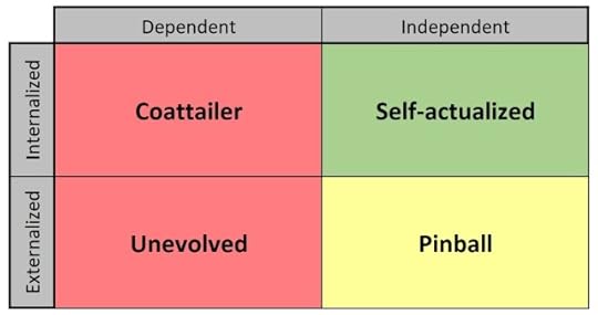 Independent & Internalized = Self-actualized: The upper right quadrant. This means you give more than you take and you live by your articulated values and beliefs. This could also be called “Evolved”, but we need to remember that evolution is a process not a destination. “Self-actualized” is also at the top of the Maslow’s “Hierarchy of Needs”. Everyone should strive to get to and spend most of their time in this quadrant. If you are here, you are in control of your life and making clear progress.