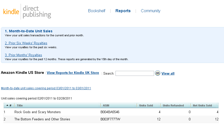 One of those Bottom Feeders sales was a gift. So I sold eleven legit copies for Kindle, plus one through Smashwords.February's numbers represent the most copies of The Bottom Feeders I've sold since releasing the book last April. The trend is rising from seven last month. Short story collections don't traditionally do as well as novels (in any format), but I'm not complaining. The Bottom Feeders had a crazy little bounce this weekend, selling five copies between Friday and Monday. Not big numbers for some of the Kindle people, but I can't explain the bump. I'll be watching this closely. After all, it is an experiment.