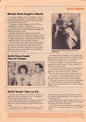 I did a little house cleaning this week. Exciting times. From a September 1986 Weekly Reader...Giant Sharks, Soviet Circus Couples, and a Rambo reference...
